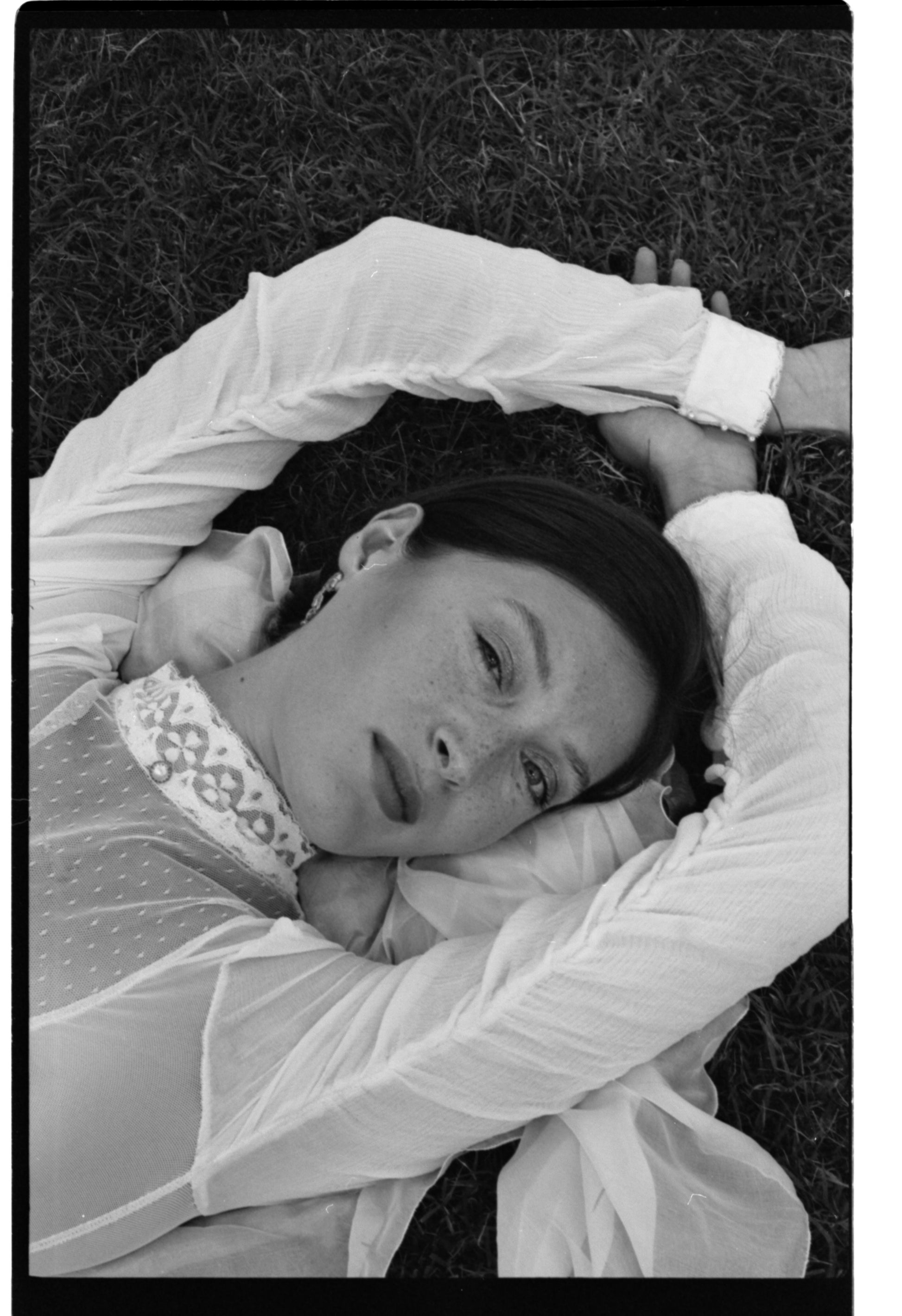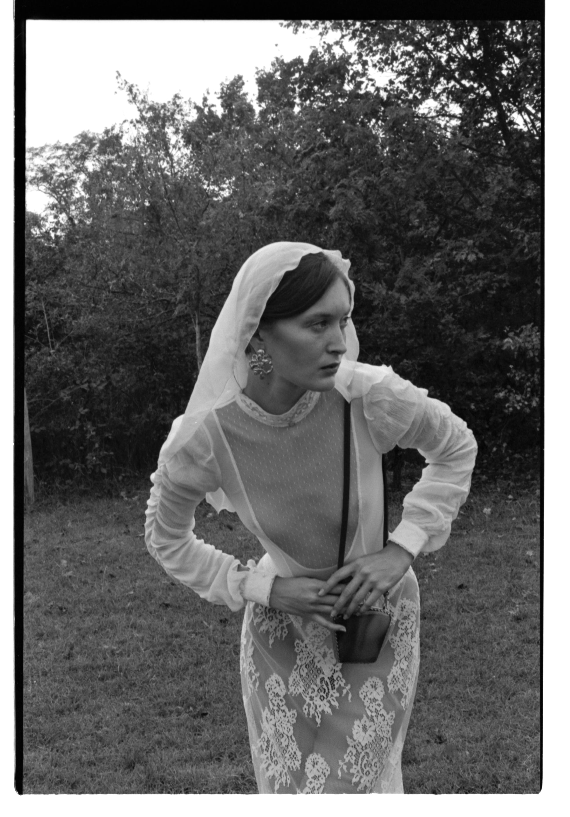 A high collar in Calais lace adorned with an antique hand-sewn pearl.